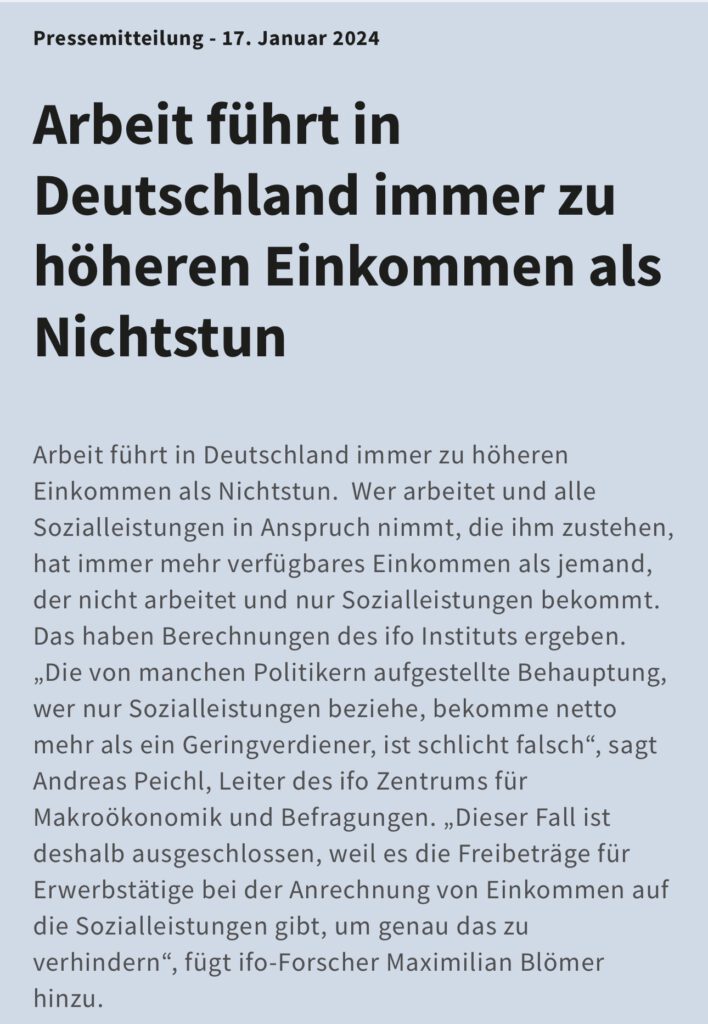 · Diese Behauptung ist falsch: Menschen mit Arbeit haben immer und in jeder Konstellation – von einem Single bis hin zu einer Großfamilie – mehr Geld als Menschen im Bürgergeld. (https://lnkd.in/dAVufc3n)