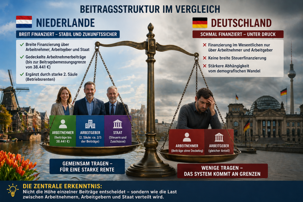 Die Niederlande gelten als eines der stabilsten Rentensysteme Europas. Der Unterschied zu Deutschland liegt weniger in einzelnen Beitragssätzen – sondern in der Struktur der Finanzierung und der Kombination der Systeme.