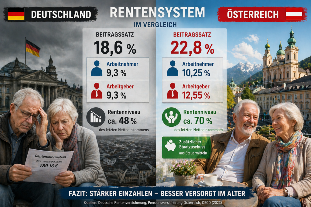 Ein Blick nach Österreich zeigt, dass das Umlagesystem sehr wohl leistungsfähig sein kann. Dort beträgt der Beitragssatz 22,8 %, wobei Arbeitnehmer 10,25 % und Arbeitgeber 12,55 % tragen. Zusätzlich fließen erhebliche Steuermittel in das System. Das Ergebnis ist ein deutlich höheres Rentenniveau als in Deutschland.